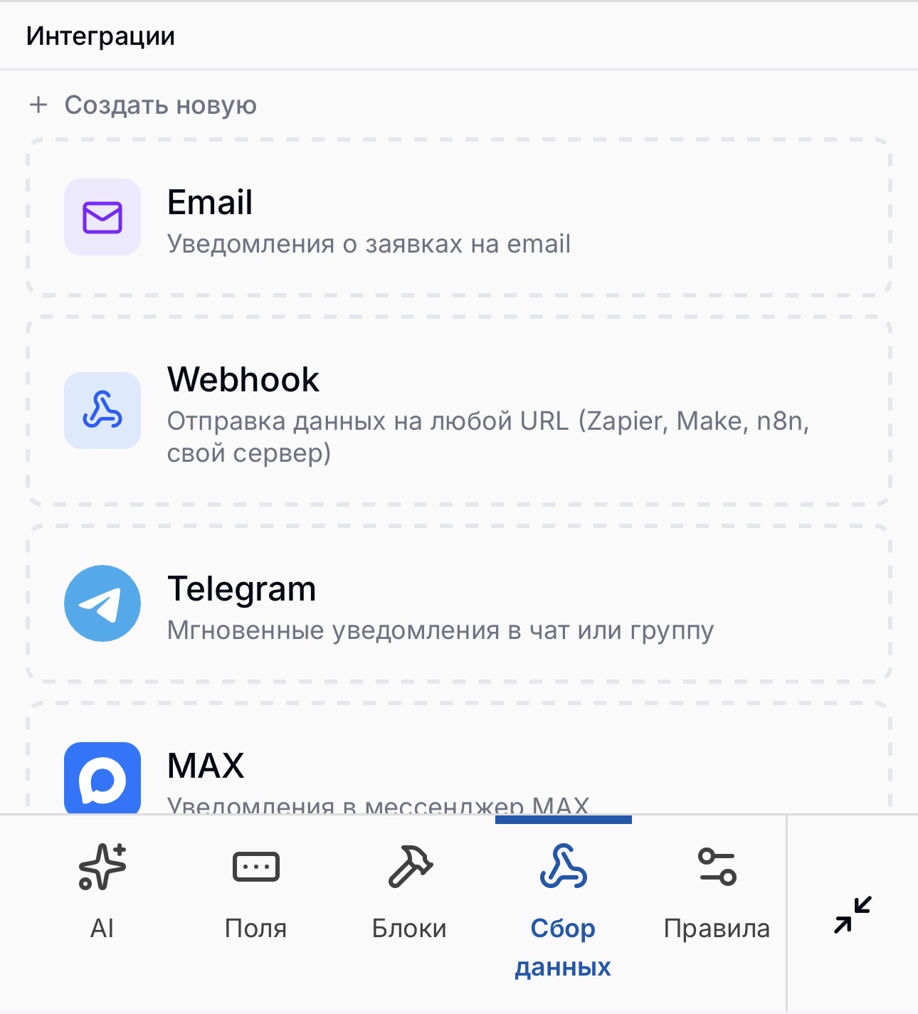 - Получать уведомления — мгновенно узнавать о новых заявках в Telegram или Max